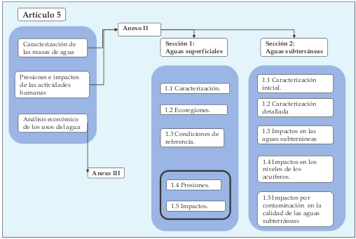 La caracterización de las masas de agua y el análisis de presiones impactos, suponen, en el caso de las aguas superficiales, haber realizado las siguientes tareas: localización y límites de las masas de agua, mapa de las ecorregiones y tipos de masas de agua, propuesta de las condiciones de referencia para cada tipo de masa de agua, identificación de presiones: contaminación puntual y difusa, presiones cuantitativas y alteraciones morfológicas y del uso del suelo, análisis de los impactos comprobado y probable e identificación de masas de agua en riesgo de no alcanzar el buen estado ecológico. En el caso de las aguas subterráneas las tareas son: localización de presiones: extracción, contaminación puntual y difusa, análisis de los impactos y finalmente identificación de las masas de agua subterránea en riesgo de no alcanzar el buen estado ecológico.
